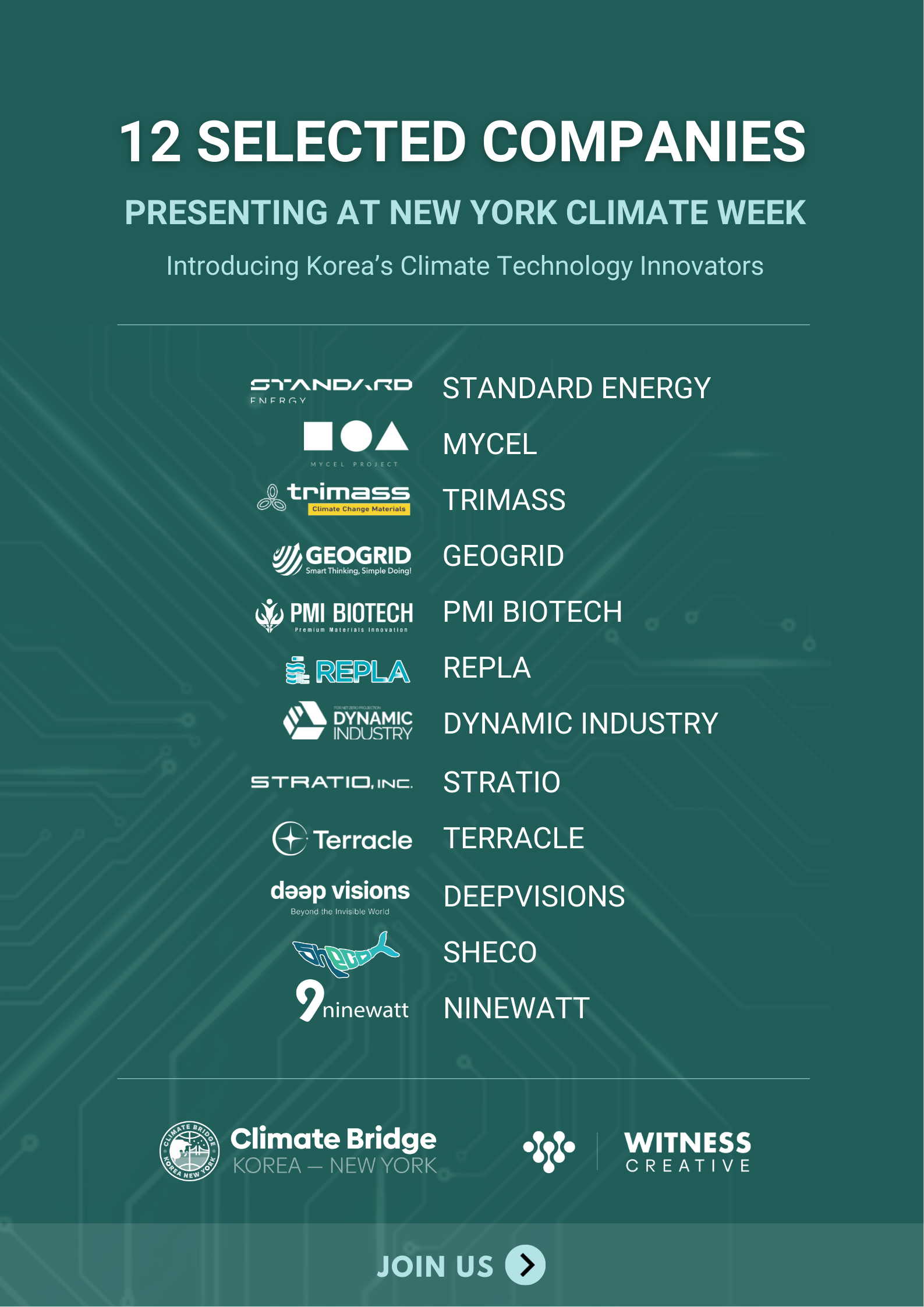 We are proud to unveil the 12 innovative Korean climate technology companies selected to present at the Korean Climate Technology Summit during New York Climate Week.